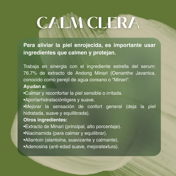 La formula contiene 76.7% extracto de apio de agua que mantiene la piel hidratada y Calm-Clera, nuestro ingrediente patentado, que contiene extracto de plantas mantiene la piel saludable.